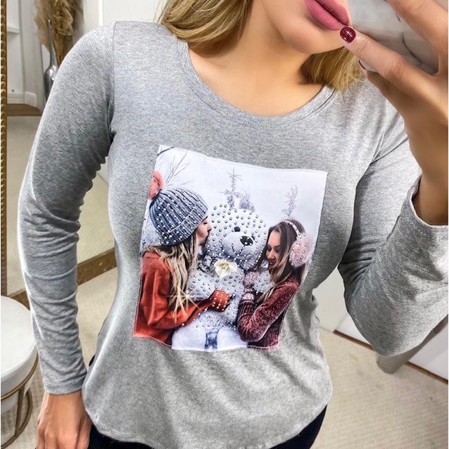 T Shirt Feminina Urso Manga Longa Cinza Shopee Brasil